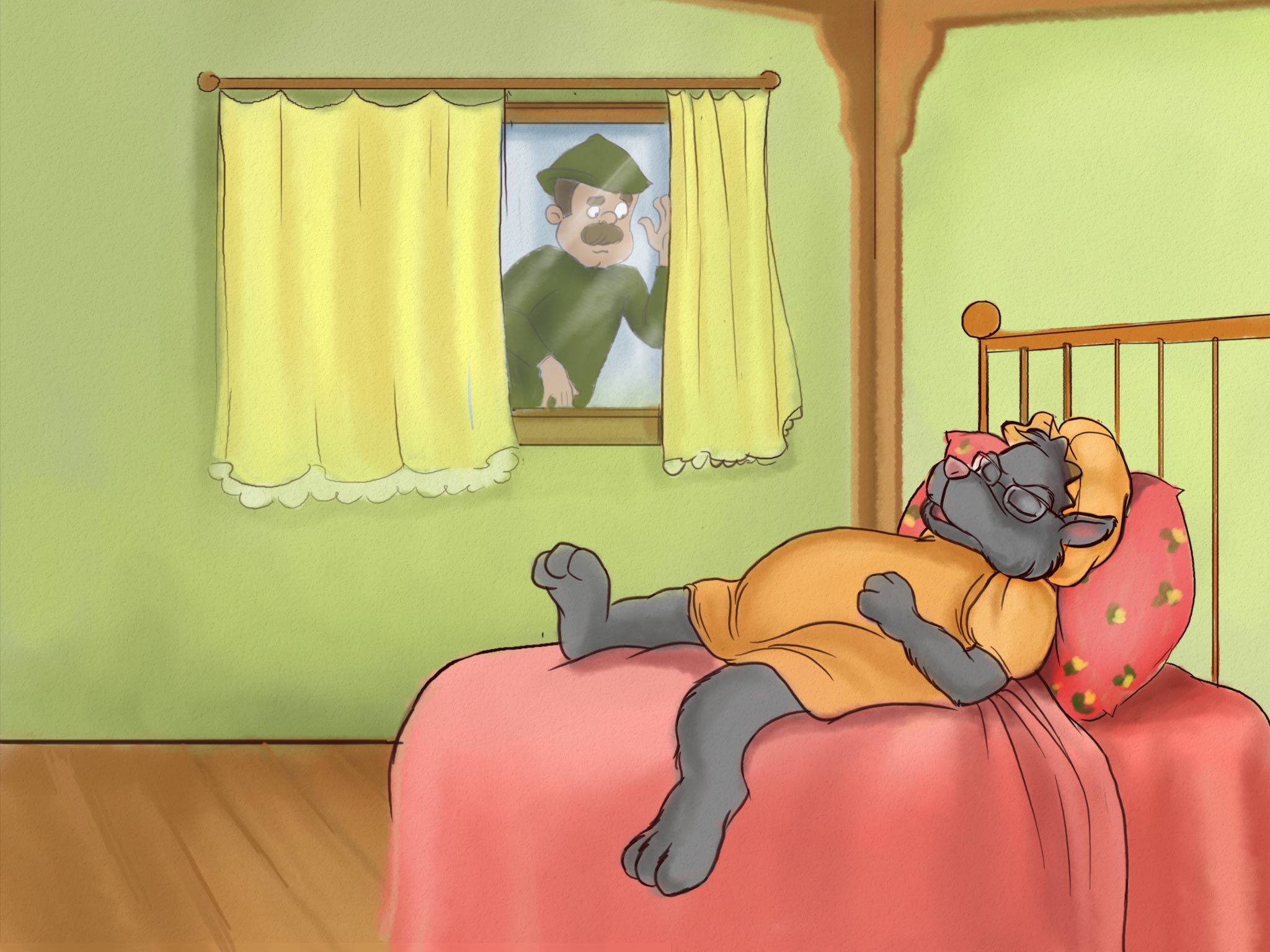 O lobo entrou na casa, foi até a cama da velhinha e a comeu inteira. Aí, ele vestiu as roupas dela e deitou na cama.